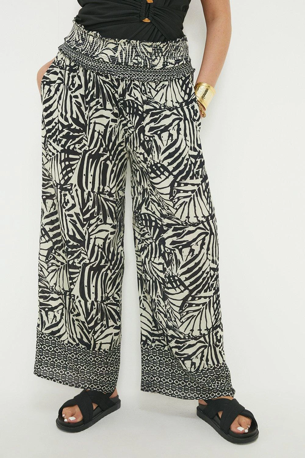 Dorothy Perkins Curve Black Tropical Crinkle Wide Leg Trouser