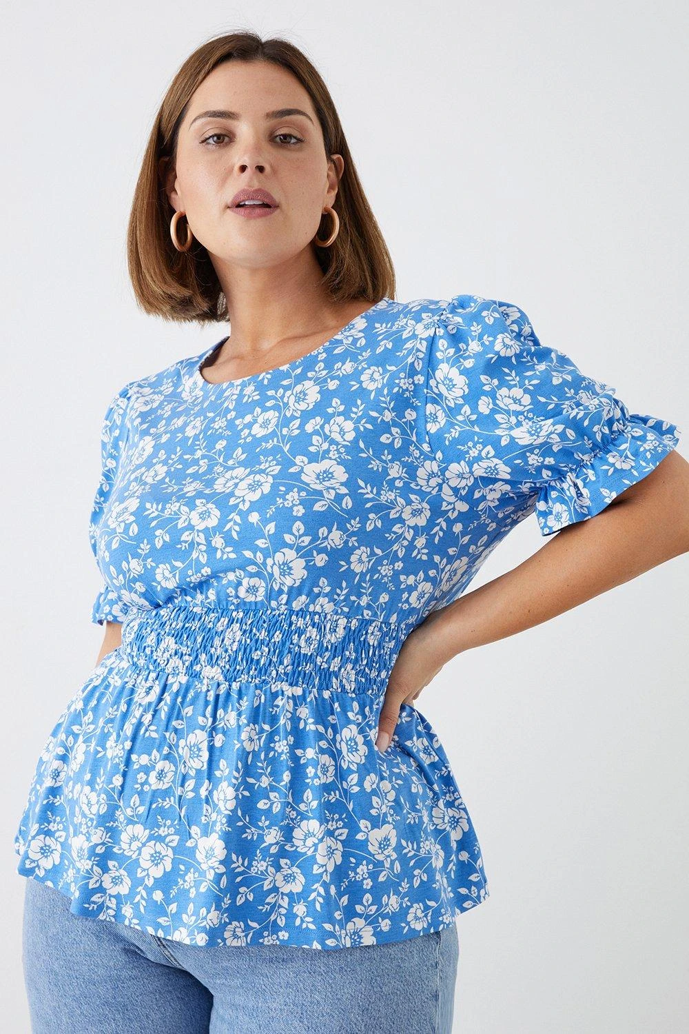 Dorothy Perkins Curve Blue Floral Shirred Waist Puff Sleeve Top
