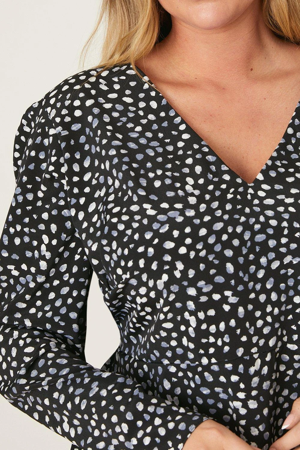 Dorothy Perkins Curve Blue Spot V Neck Long Sleeve Blouse