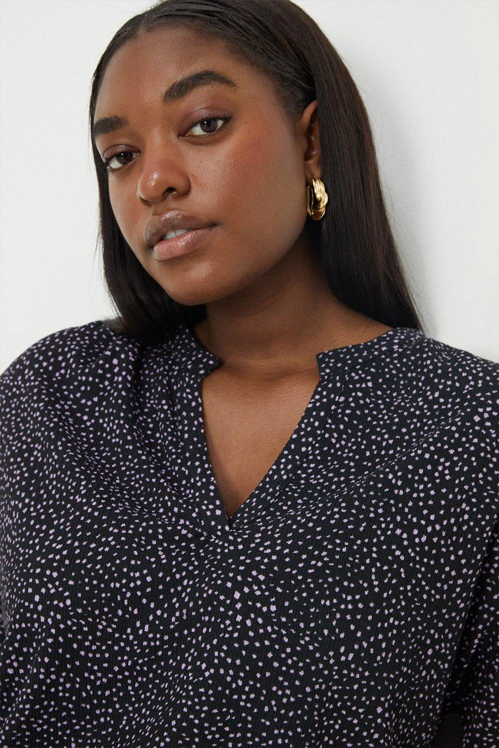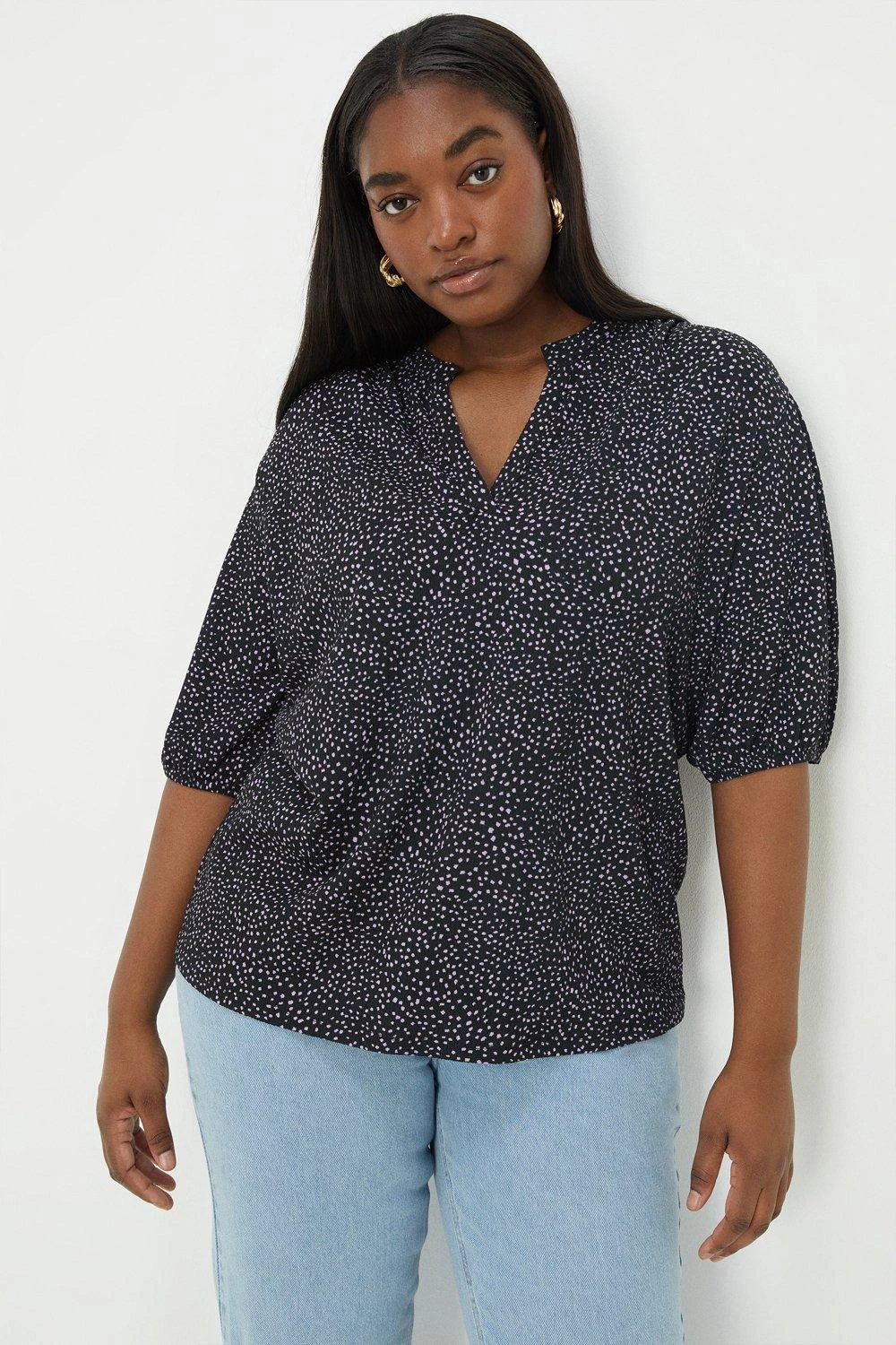 Cami or blouse? Shirt or bodysuit? Whatever you’re after, our women’s tops have you covered for every event in the social calendar. From casual fits to elevated styles for special occasions, we make it easy to nail the ‘jeans and a nice top’ look. Think puff sleeves, pretty prints, wrap silhouettes and so much more. Style: Curve Mono Spot Short Sleeve Overhead Blouse. Ideal for: Daywear. Model wears size UK 18 and is 5′ 9″ tall. Make-up & Fragrance: Primer (Estée Lauder, The Mattifier Shine Control Perfecting Primer + Finisher), Foundation (Lancôme, Teint Miracle Luminous Satin Foundation), Mascara (Estée Lauder, Double Wear Zero-Smudge Lengthening Mascara), Blusher (Benefit, Wanderful World Blushes Starlaa Rosy Bronze Powder Blusher), Setting Spray (Benefit, Porefessional Super Setter Setting Spray Mini 30ml), Fragrance (Elie Saab, Elixir).