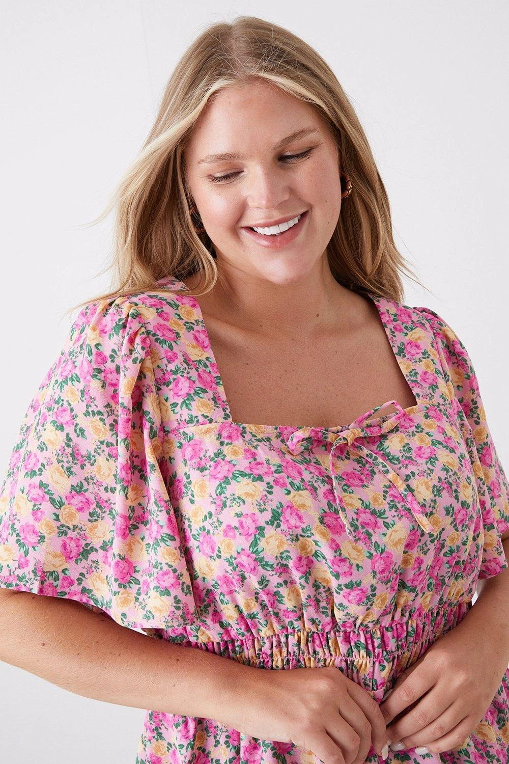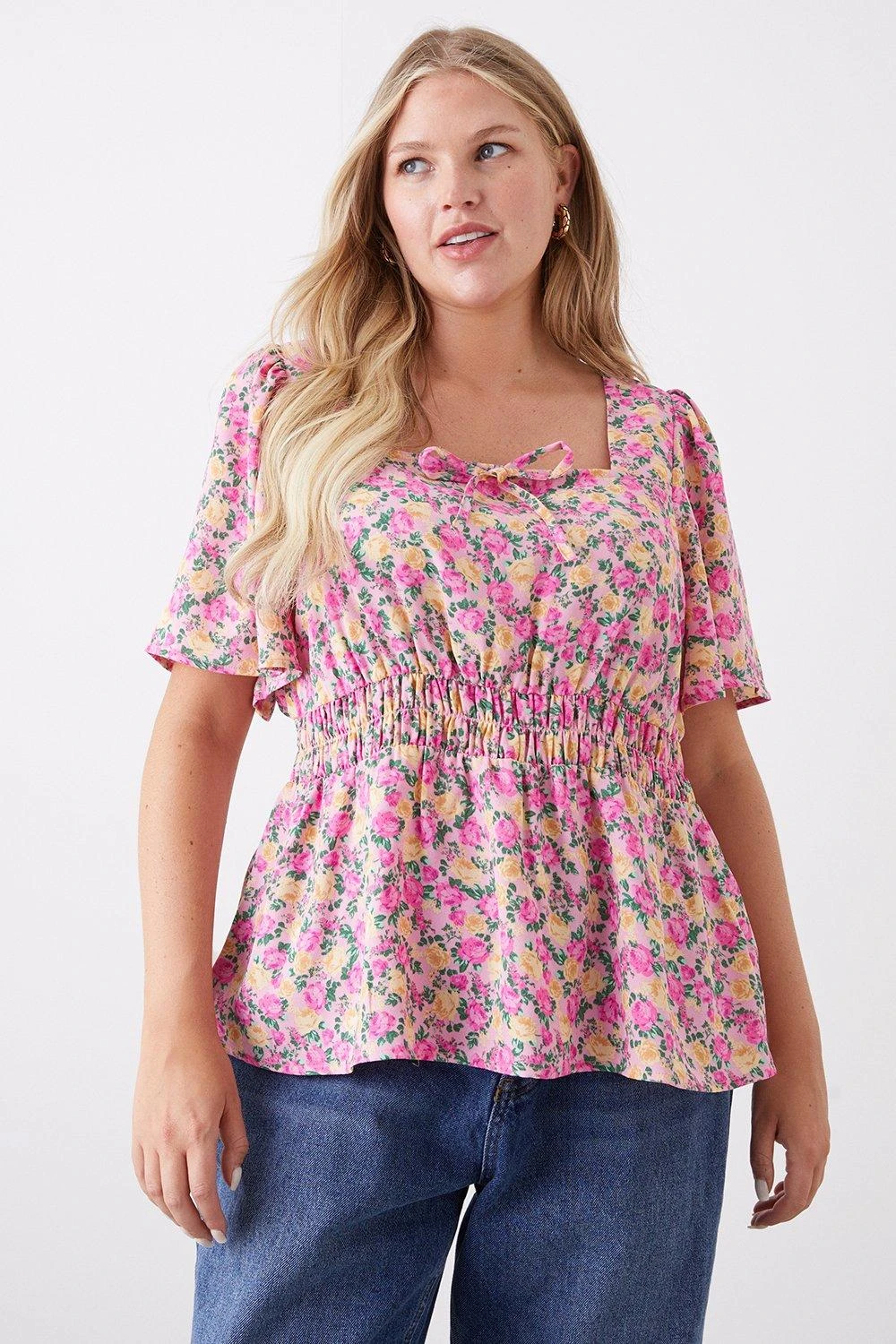 Dorothy Perkins Curve Pink Floral Sihrred Bodice Tie Blouse