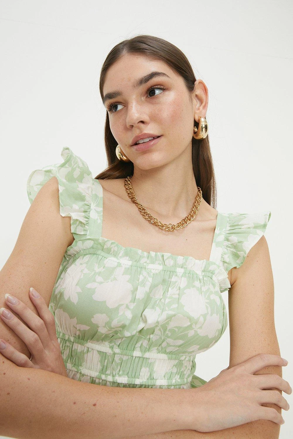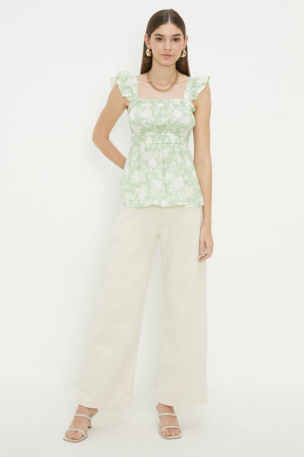 Cami or blouse? Shirt or bodysuit? Whatever you’re after, our women’s tops have you covered for every event in the social calendar. From casual fits to elevated styles for special occasions, we make it easy to nail the ‘jeans and a nice top’ look. Think puff sleeves, pretty prints, wrap silhouettes and so much more. Style: Green Floral Frill Strap Cami Top. Ideal for: Daywear. Design: Ruffle. Model wears size UK 10 and is 5′ 9″ tall. Make-up & Fragrance: Primer (Estée Lauder, Futurist Aqua Brilliance Watery Glow Primer), Foundation (Estée Lauder, Futurist Hydra Rescue Moisturizing Foundation SPF45), Bronzer (Benefit Hoola Matte Powder Bronzer), Mascara (Benefit, They’Re Real Lengthening Mascara Jet Black 8.5g), Setting Spray (Urban Decay, All Nighter Setting Spray 118ml), Fragrance (Jimmy Choo Eau De Parfum Signature).