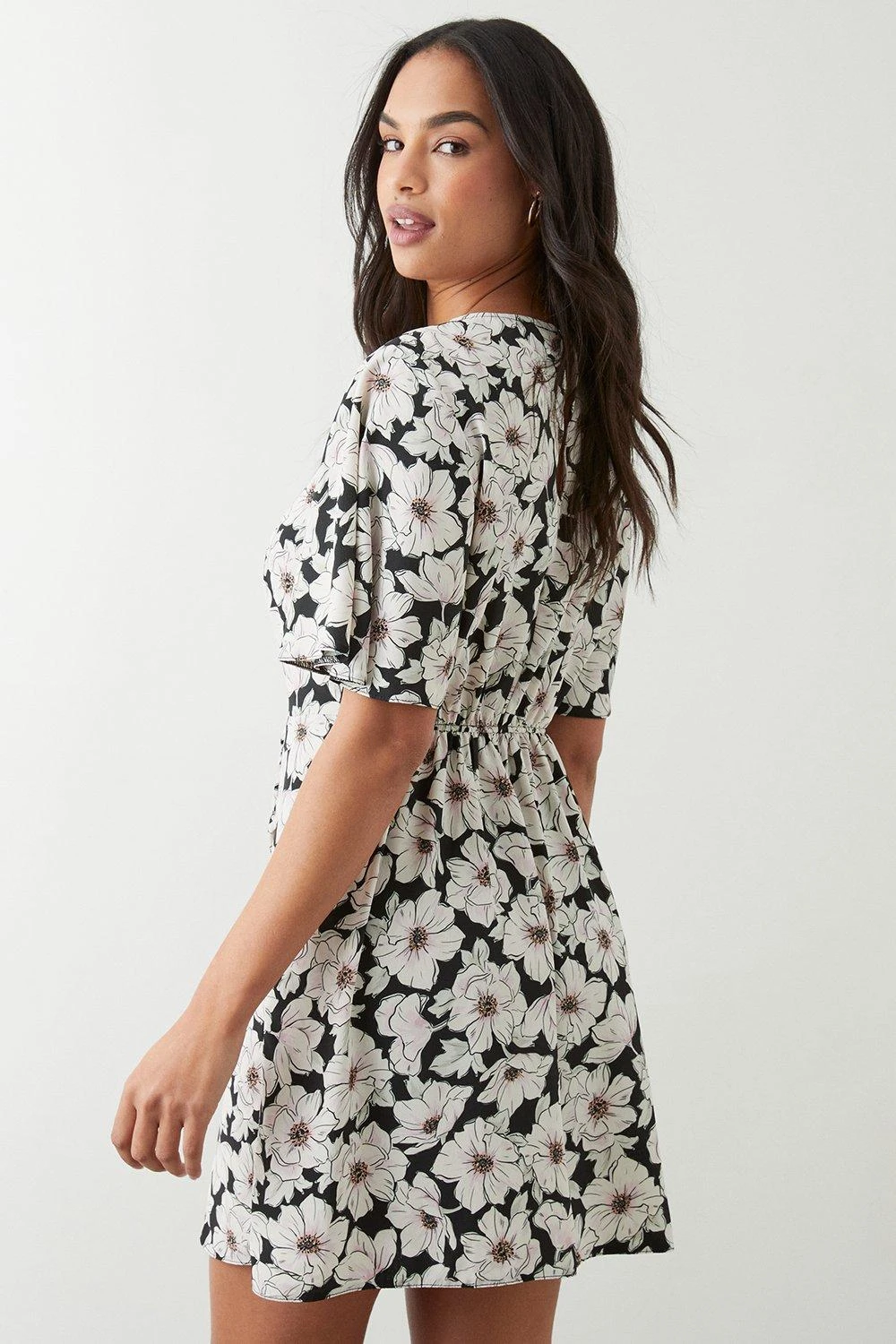 Dorothy Perkins Mono Floral Keyhole Angel Sleeve Mini Dress