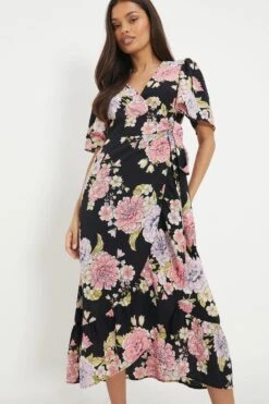 Dorothy Perkins Petite Floral Print Ruffle Angel Sleeve Wrap Midi Dress
