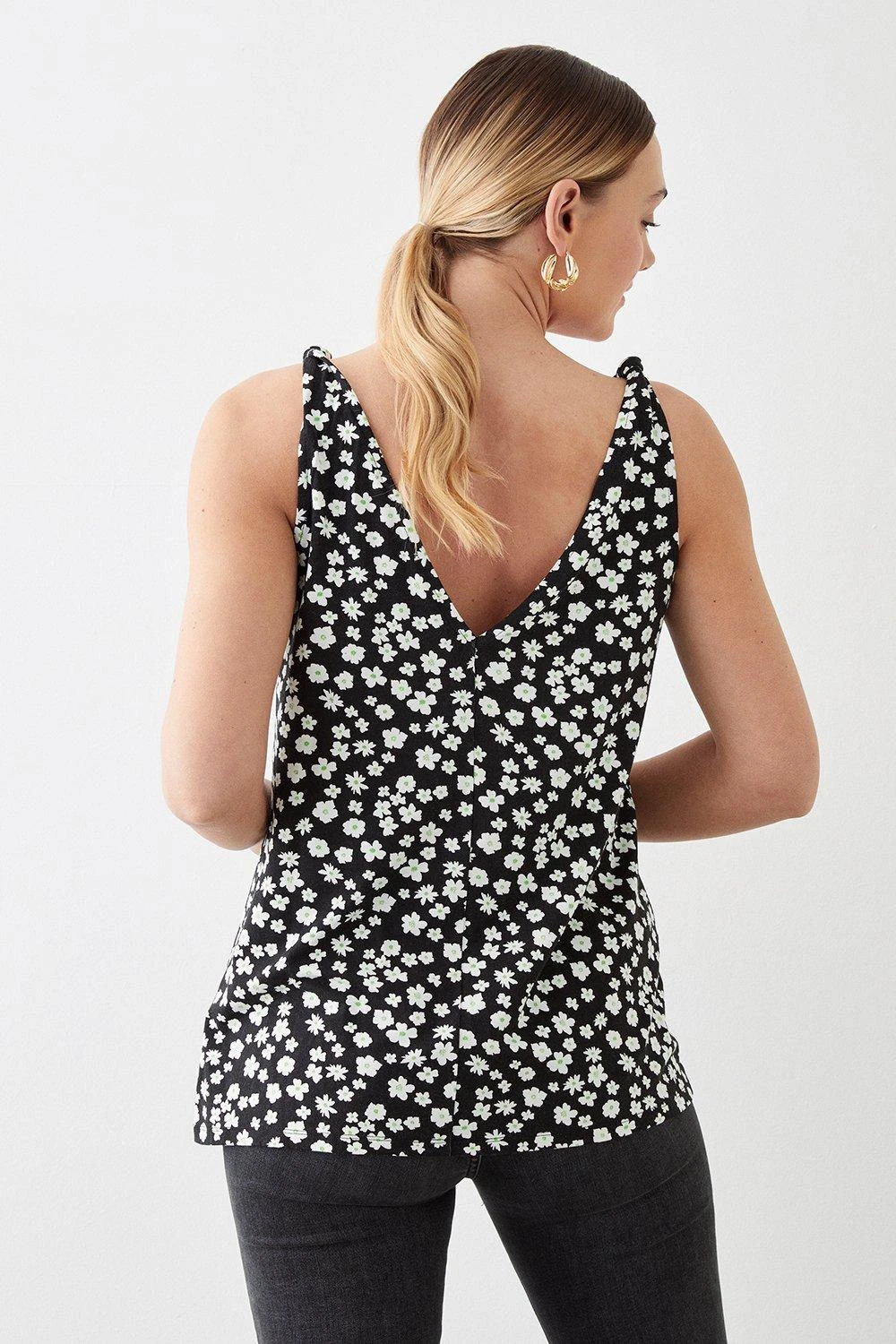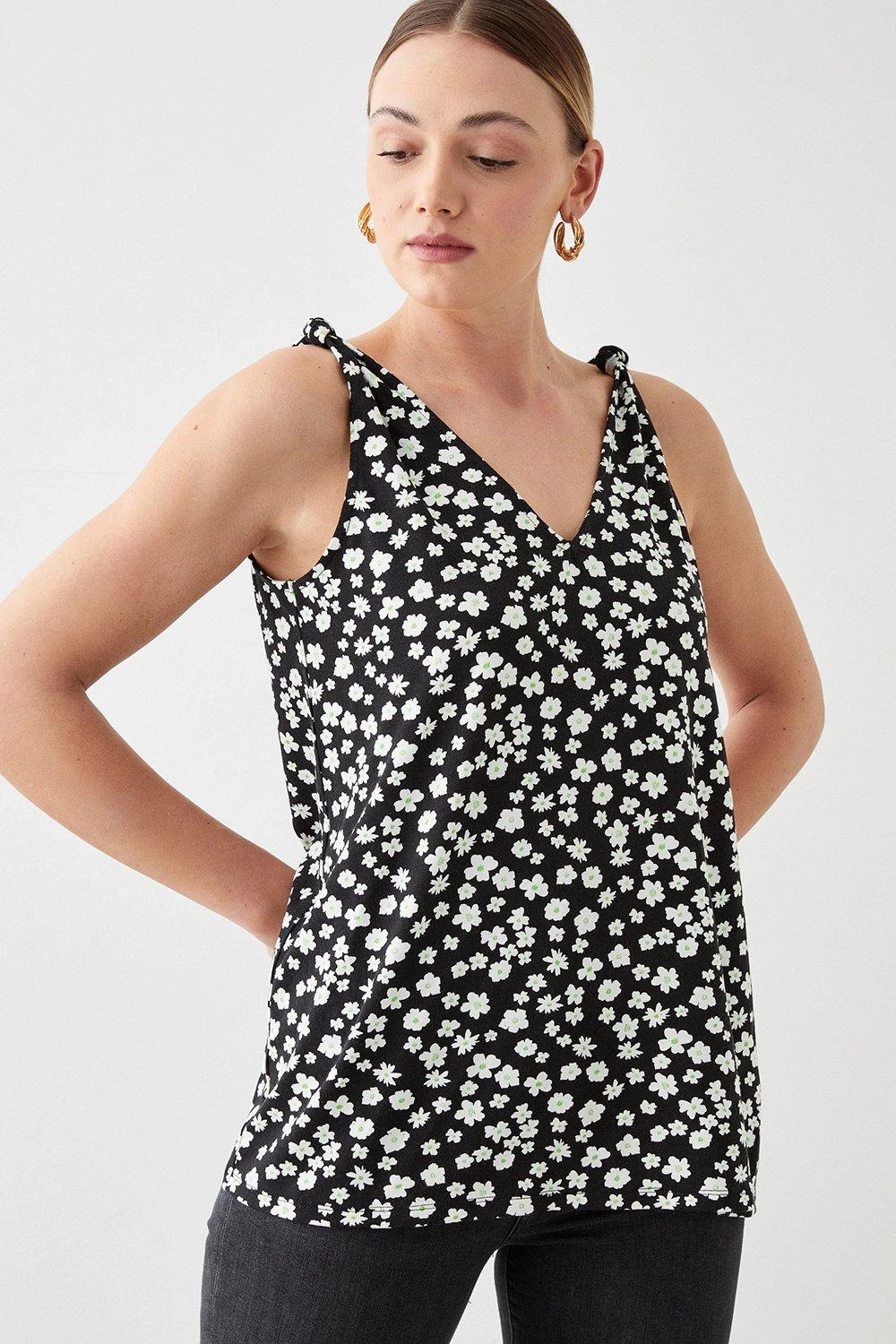 Cami or blouse? Shirt or bodysuit? Whatever you’re after, our women’s tops have you covered for every event in the social calendar. From casual fits to elevated styles for special occasions, we make it easy to nail the ‘jeans and a nice top’ look. Think puff sleeves, pretty prints, wrap silhouettes and so much more. Style: Tall Knot Detail Printed Vest. Ideal for: Daywear. Design: Knots. Model wears size UK 10 and is 5′ 11″ tall. Make-up & Fragrance: Primer (Estée Lauder, Futurist Aqua Brilliance Watery Glow Primer), Foundation (Estée Lauder, Futurist Hydra Rescue Moisturizing Foundation SPF45), Bronzer (Benefit Hoola Matte Powder Bronzer), Mascara (Benefit, They’Re Real Lengthening Mascara Jet Black 8.5g), Setting Spray (Urban Decay, All Nighter Setting Spray 118ml), Fragrance (Jimmy Choo Eau De Parfum Signature).